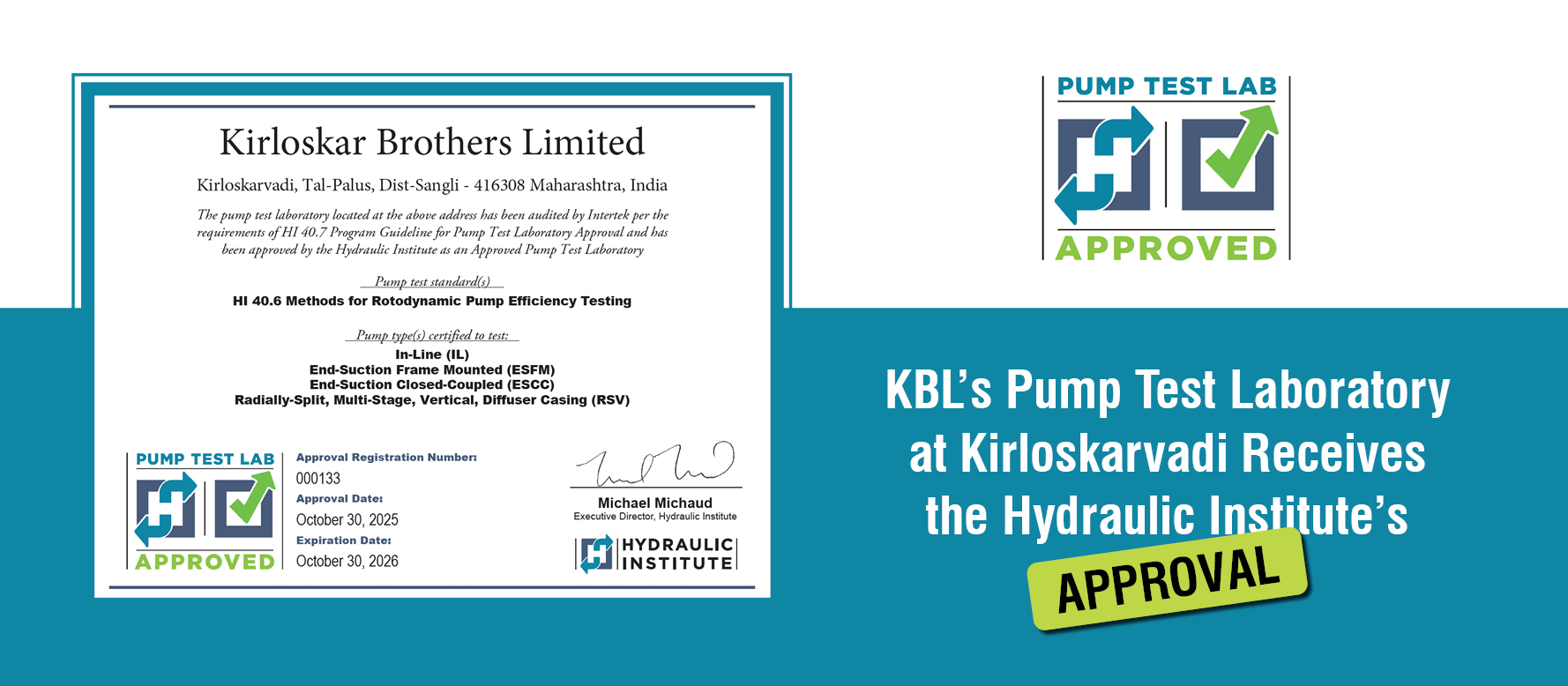 Kirloskar Brothers Limited (KBL) has achieved a landmark milestone as its state-of-the-art pump testing laboratory at Kirloskarvadi, Maharashtra, received approval from the Hydraulic Institute (HI) under its prestigious Pump Test ...